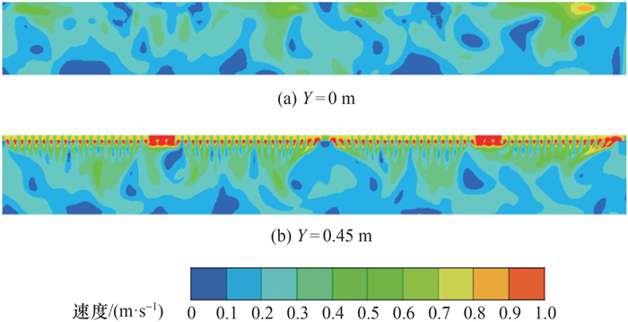 图 8给出了车身宽度方向Y=0 m和车厢送风口截面(Y=0.45 m)的气流速度分布云图。可以看到,车厢内部风速相对均匀,基本不超过1 m/s。在回风口附近的速度场会产生涡旋,这是由于回风口处是往上抽吸的。根据图 8可以看出,车厢送风口所在截面的速度分布呈现出较为明显的与送风口布置位置相关的特征,送风口下方的风速较大。对比图 8a和8b可以看到,送风口所在截面处的风速要略微高于车厢中心截面处的风速。较大的风速会阻碍烟气向车厢顶部的蔓延,从而导致烟气无法快速进入C形槽内,无法快速到达火灾探测器所在的位置。因此,在车厢宽度方向上,送风口所在截面的位置相比于车厢中心截面是更不利于火灾探测的位置。建议在开展火灾探测报警实验测试时,选取送风口所在截面作为一个实验场景。