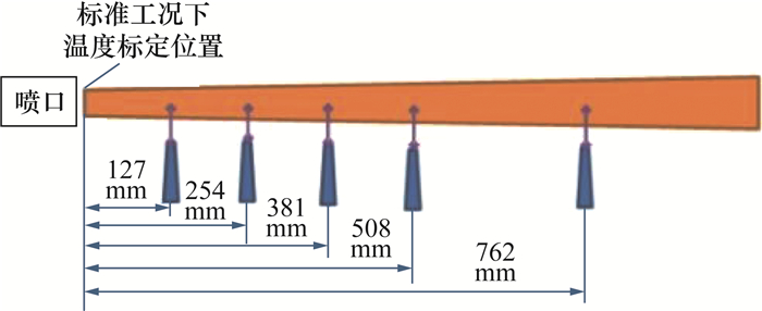 射流火焰的温度和热流密度通过热电偶和热流计进行测量。改变热电偶、热流计与喷嘴之间的水平距离,测量5个不同位置处火焰的温度和热流密度,如图 3所示。