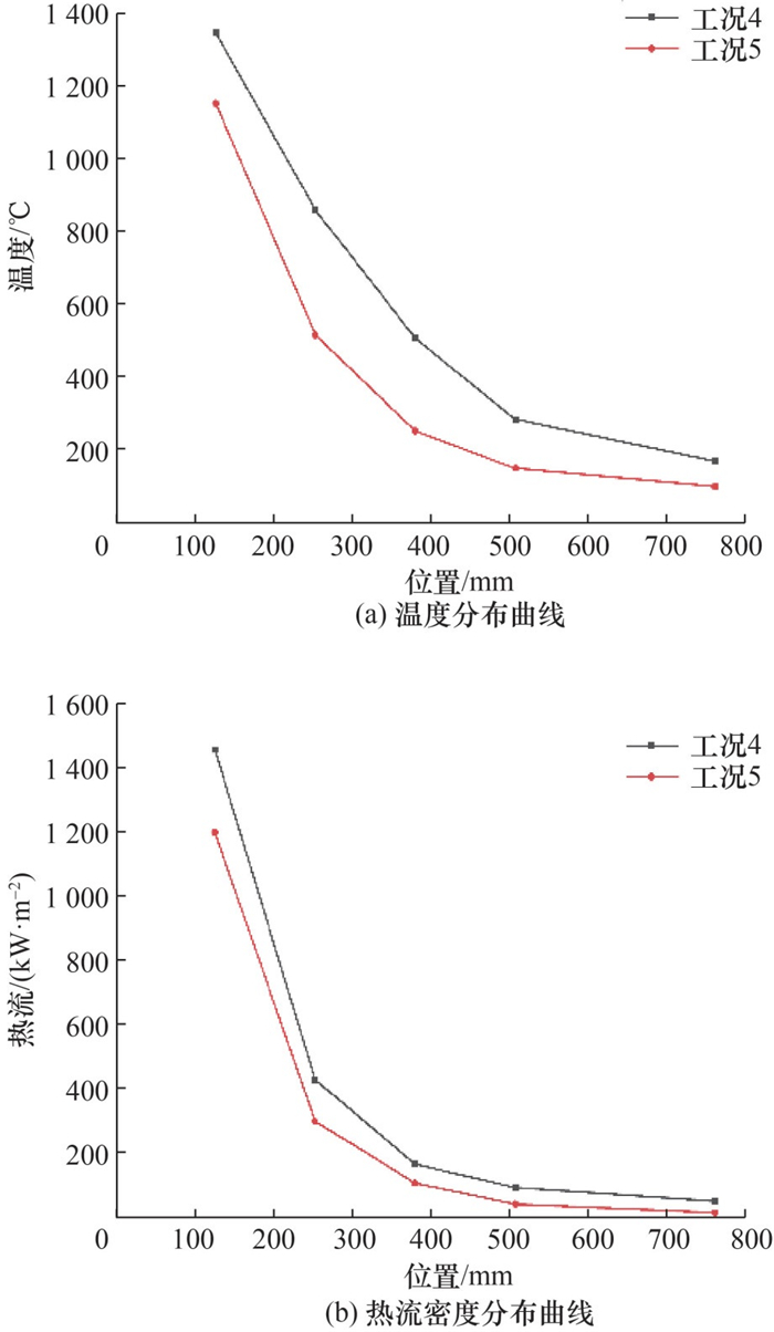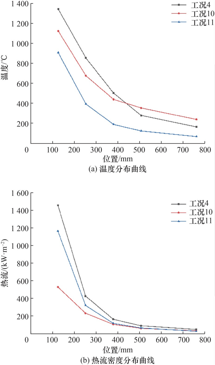 | 图 6 不同燃烧器内部压力下温度、热流密度分布曲线 |