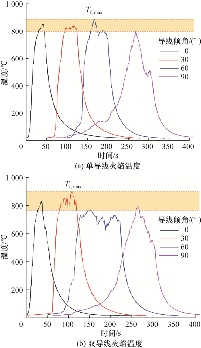 2.3 火焰温度图 10展示了布置于导线正上方、与火焰接触的热电偶温度随时间的变化曲线。在导线火蔓延过程中,火焰逐渐向热电偶靠近,热电偶温度逐渐增加,直至火焰完全到达热电偶时热电偶温度达到峰值;随后,火焰逐渐远离热电偶,热电偶温度逐渐降低至接近环境温度。单双导线火蔓延火焰温度均能达800 ℃左右,最高能达到886.5 ℃。倾斜角度及导线布置方式对火焰最高温度的影响不明显。
