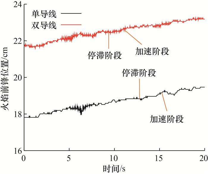 此外,滴落和流淌现象对导线火蔓延速率有一定的影响。图 12展示了典型情况下火焰前锋位置随时间变化曲线的局部放大图。在单导线与双导线条件下,火焰前锋基本上是随着时间线性增长的,但在细节上会出现轻微波动。从图 12中可以看出,单双导线火焰前锋位置的变化并非完全呈线性增长,而是呈现出“停滞—加速”周期性变化,双导线火焰前锋位置的周期性变化更为明显。这是由于导线发生熔融材料滴落或流淌时,火焰体积急剧下降,火焰对聚乙烯绝缘层的热反馈减少,火焰锋面扩散缓慢。双导线熔融材料的滴落及流淌频率更大,导致在火焰前锋蔓延的过程中,停滞阶段的数量增加,进而使得火蔓延速率更小,火焰前锋位置随时间周期性变化更明显。这一观察结果也表明,熔融材料的滴落或流淌与火焰在导线上的蔓延有关,也有降低火蔓延速率的作用,而双导线的流淌和滴落频率相较于单导线更高,这也在一定程度上导致双导线火蔓延速率小于单导线。