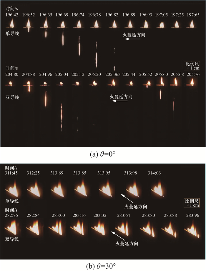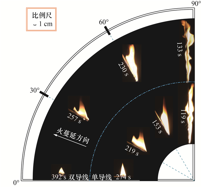 为研究单导线和相邻双导线在不同倾斜角度下的火蔓延特性,首先开展了倾斜角度0°、30°、60°、90°条件下单导线火蔓延实验。在此基础上,为探究不同倾角下导线数量对火蔓延特性的影响,开展了倾斜角度0°、30°、60°、90°条件下平行双导线火蔓延实验。工况设计如表 2所示。为保证实验结果的准确性,每次实验均在无外界干扰的环境中进行,实验时环境温度为10 ℃,环境压力为101 kPa,每个工况实验至少重复开展3次。