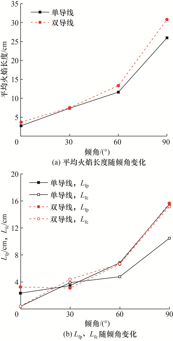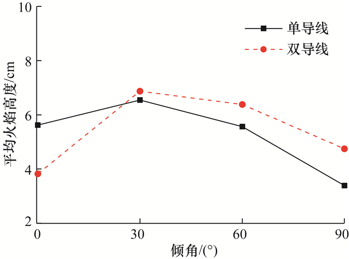 2) 平均火焰长度、火焰包裹的裸露导线的长度、被火焰加热的导线绝缘层的长度均随着导线倾斜角度的增加而增加,平均火焰高度随着导线倾斜角度的增加先增大后减小。除双导线倾角0°情况外,双导线平均火焰高度、平均火焰长度均大于单导线。