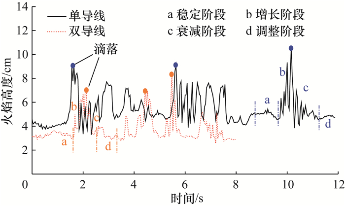 1) 在单双导线火蔓延过程中,熔融绝缘材料存在滴落和流淌行为,使得火焰形态呈周期性变化,相邻双导线火蔓延过程中发生滴落和流淌的频率大于单导线。