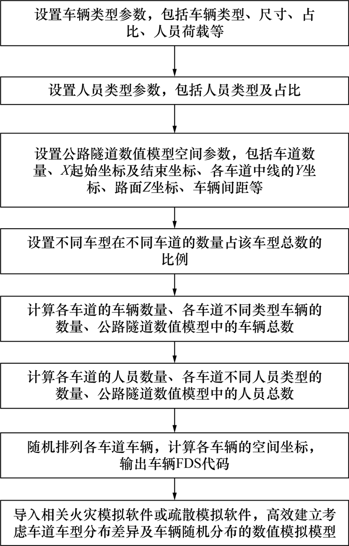 1 隧道车辆随机布置算法及系统 1.1 算法实现流程本文针对公路隧道火灾及疏散模拟建模过程中车辆布置的需求及难点,提出了一种基于隧道数值模型空间坐标、车辆尺寸、车型比例、不同车型的车道分布差异等参数来随机布置车辆的方法。隧道车辆随机布置算法的实现流程如图 1所示。