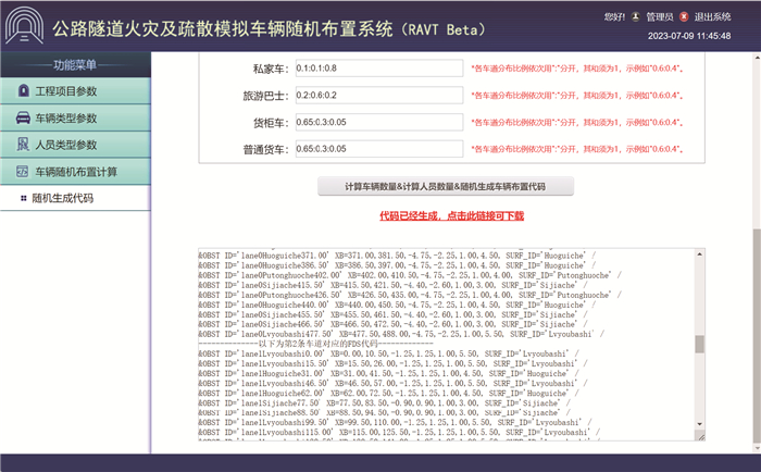 1.3 系统开发应用1.2节的算法流程,本文基于HTML5、CSS、JavaScript开发了对应的RAVT系统(如图 2所示)。应用该系统可快速计算出车辆布置的参数及人员荷载参数,并自动生成相应的车辆模型FDS代码,可实现高效准确地布置公路隧道火灾及疏散数值模型中的车辆。FDS代码可用于直接建立火灾模型,也可导入到Pyrosim和Pathfinder中进行火灾模拟和疏散模拟。该系统界面由4个模块构成,分别为工程项目参数设置模块、车辆类型参数设置模块、人员类型参数设置模块及车辆随机布置计算模块。