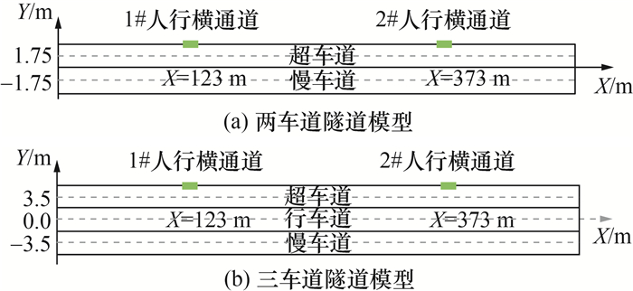 为研究车道车型分布差异及车辆随机分布对隧道火灾人员疏散的影响及验证RAVT系统的可行性,本文拟建立隧道人员疏散模型,分别考虑两车道、三车道两种车道场景。隧道模型长度设为500 m,即X起始值为0.0 m,X结束值为500.0 m。两车道隧道模型宽度为7.5 m,各车道宽为3.5 m,依次为慢车道、超车道。各车道中线Y值分别为-1.75和1.75 m;三车道隧道模型宽度为11 m,依次为慢车道、行车道和超车道。各车道中线Y值分别为-3.5、0.0和3.5 m。两车道隧道和三车道隧道于超车道一侧均设置了宽为0.5 m的检修平台。人行横通道净高为2.5 m,净宽为2.0 m,分别设置于隧道长123与373 m处,依次为1#人行横通道和2#人行横通道,间隔为250 m。两车道隧道模型与三车道隧道模型的Z起始值均为1.0 m。隧道模型的车道平面示意图如图 3所示。