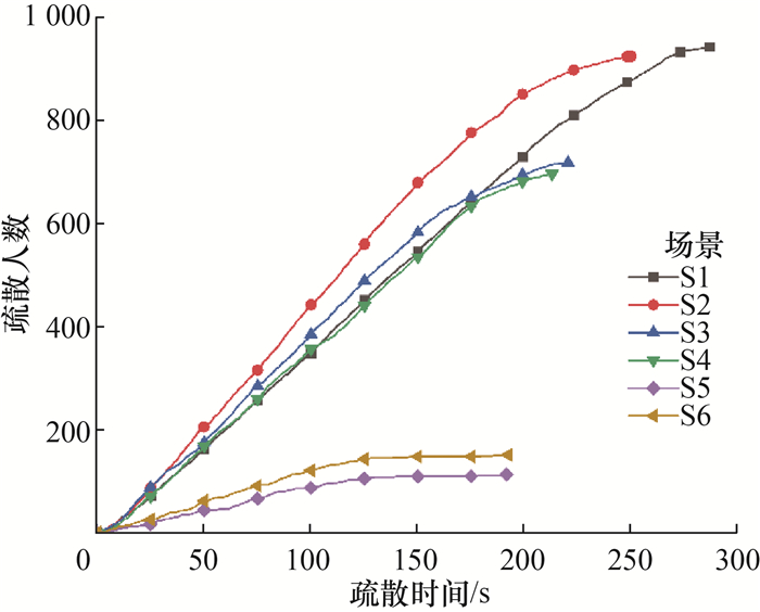 3 结果与分析 3.1 疏散结果必需安全疏散时间(required safe evacuation time, RSET)指起火时刻至人员疏散到安全区域的时间,如式(18)所示。其中:Ta、Tr为报警探测时间、人员响应时间,分别取为60、120 s[25]。Tm为疏散仿真模拟所得人员疏散行走时间。