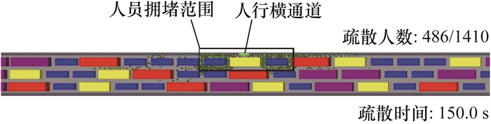 当车辆极度拥堵和车辆拥堵时,各车道车型比例均匀分布时人员疏散所需时间普遍较长,即平均值较大。这可能是由于各车道车型比例均匀分布时,超车道大型车辆比实际情况多,车辆滞留在横通道入口的可能性增大,易造成疏散时人员拥堵。被困人员必须穿过车辆间的间隙才能进入人行横通道,疏散距离大幅增加,导致疏散时间大幅增加。横通道入口滞留大型车辆导致人员拥堵的典型情况如图 6所示。该典型场景为S7场景下疏散时间最长的场景,即三车道隧道、车距为1.5 m、各车道车型比例均匀分布。疏散时间取为150.0 s。Exited表示该时刻已疏散人数为486,该场景总疏散人数为1 410。