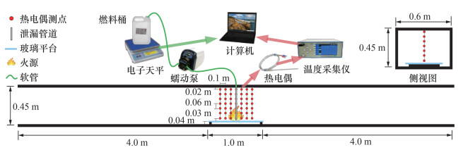 1 试验设计 1.1 试验装置与测点布置建立缩尺比例为1∶10的缩尺寸狭长受限空间模型,如图 1所示。受限空间模型尺寸为9 m长、0.6 m宽、0.45 m高。壁面采用2 cm厚的石棉板。在模型中心位置水平放置一块长1 m、宽0.45 m的防火玻璃作为泄漏燃料的流淌燃烧平台[1, 15],该平台距离模型底面的高度为4 cm。为了模拟燃料泄漏情况,使用直径为1 cm的不锈钢管作为泄漏管道,从顶棚向下垂直延伸至流淌平台。泄漏管道底端距离流淌平台1 cm,上端连接软管,软管与蠕动泵相连。蠕动泵另一端的软管伸入到燃料桶内。在燃料桶下方放置精度为0.1 g的电子天平,实时测量燃料的泄漏速率。流淌火试验开始时,启动蠕动泵,蠕动泵会持续将燃料以恒定的泄漏速率输送到流淌平台。一旦燃料从泄漏管道流出来,立即点火。在开展油池火试验时,撤掉燃料泄漏管道,将装有燃料的油池放置在受限空间内的不锈钢托盘上,托盘下方放置电子天平,用于实时测量燃烧过程中燃料的质量变化。