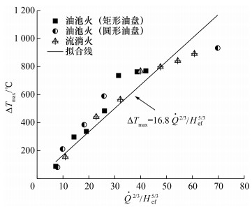 图 10给出了流淌火和油池火的顶棚烟气最大温升与火源功率的关系。可以看到,受限空间流淌火燃烧稳定阶段的顶棚最高烟气温度可用式(5)进行较好的预测。并且,在相同的火源功率情况下,流淌火的顶棚烟气最大温升与油池火相差不大。