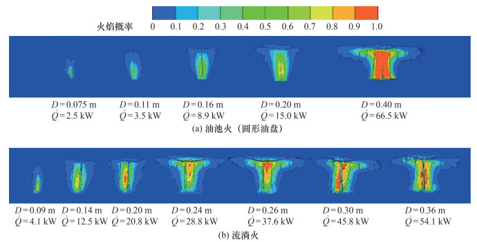 图 3展示了使用上述火焰图像处理方法得到的圆形油池火和流淌火在燃烧稳定阶段的火焰概率云图。通过对比圆形油池火的火焰概率云图和油盘直径发现,将火焰概率大于0.1作为确定火源直径的判断标准是准确的。根据该标准,获得了不同泄漏速率下流淌火在燃烧稳定阶段的火源直径,汇总在表 1中。