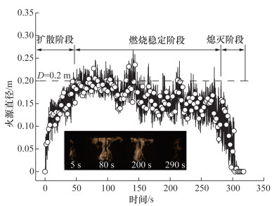 图 4以泄漏速率为0.777 g/s的工况为例,展示了火源直径随时间的变化。可以看到,点火之后火源直径迅速增大,在燃烧50 s之后火源直径在一个脉动范围内保持稳定,在280 s停止泄漏燃料之后,火源直径迅速缩小,直至火焰熄灭。根据火源直径随时间的变化可以将燃烧分为3个阶段:燃烧扩散阶段、燃烧稳定阶段以及燃烧熄灭阶段。由图 3可知,该工况的燃烧稳定阶段的火源直径为0.2 m。通过比较火焰直径的脉动变化也可以发现,本文对于燃烧稳定阶段火源直径的判断不是通过取火焰脉动的平均值(火焰概率0.5),而是采用火焰概率为0.1作为判断火源直径范围的标准。