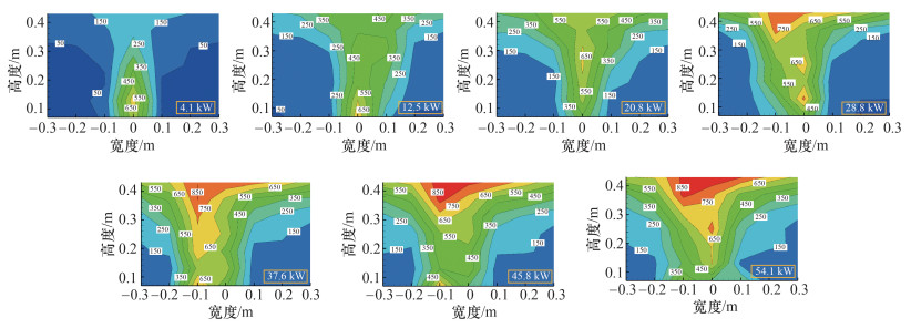 2.2 受限空间内温度分布特征2.1节的研究结果表明,在流淌火的燃烧稳定阶段,火源面积和火源功率保持稳定。因此,受限空间内的温度场在经历初始温度升高后会进入稳定阶段,类似于油池火的温度变化。图 6和7展示了受限空间内圆形油池火和流淌火在燃烧稳定阶段的温度分布云图。云图中的温度数据为燃烧稳定阶段的平均值。可以看到,随着泄漏速率的增大,流淌火燃烧稳定阶段的火源面积和火源功率均增大,受限空间内的高温区域也扩大。流淌火的温度场分布特征与油池火的类似。火源功率较小时,高温区域集中在火源根部附近。然而,随着火源功率的增大,高温区域逐渐从火源根部转移到顶棚。其原因是火源功率较小时,火焰未与受限空间顶棚相撞,形成弱羽流,导致顶棚烟气温度低于底部火焰区域的温度;随着火源功率的增大,火焰撞击顶棚,形成强羽流,与底部的火焰相比,顶棚的火焰燃烧更充分,因此顶棚的温度更高。