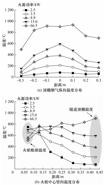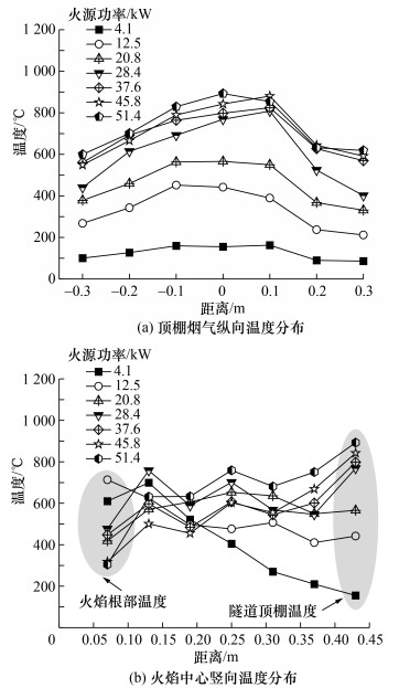 图 8和9展示了流淌火和油池火在燃烧稳定阶段,受限空间内顶棚隧道纵向温度分布以及火源竖向中心线上的温度分布。可以看到,在燃烧稳定阶段,流淌火和油池火的温度变化规律相似。随着火源功率的增大,顶棚温度不断升高,并且顶棚温度沿着纵向不断衰减。此外,在火源竖向中心线上,随着火源功率的增大,火源根部的温度逐渐降低,而顶棚的温度不断上升。这是因为火源面积越大,火源中心根部区域的燃料与空气接触越不充分,未燃烧的可燃气体越多,因此火源根部的温度降低。同时,随着火源面积的增大,越来越多的未燃烧的可燃气体在热浮力的作用下向顶棚扩散并燃烧,使火焰高度逐渐增加,火焰由弱羽流转变为强羽流。因此,顶棚温度不断上升。