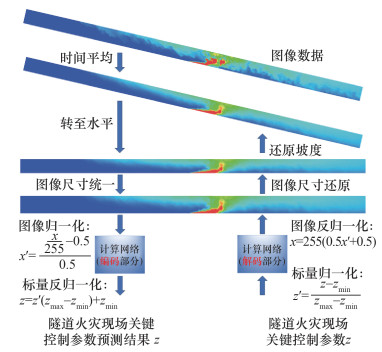1.4 数据预处理为规范化计算网络的输入和输出信息,并使网络易于训练和收敛,对数据集进行相应的数学处理[17]。如图 3所示,对于图像数据,在输入网络进行预测之前,先将所有的瞬态结果进行时间平均得到时均场结果,接着将时均场结果旋转至水平,之后将时均场信息的图像进行图像尺寸的统一(尺寸为网络的输入尺寸,即80×3 200),最后按照均匀缩放的原则将像素点的RGB[18]值放缩到[-1, 1]的区间范围内。经过编码部分的计算之后,获得归一化后的标量信息,因此需要进行一次反归一化即可获得最终隧道火灾现场关键控制参数的预测结果。对于6项火灾的标量信息,使用最小最大归一化方法,将其等比例缩放到[0, 1]的区间范围内。对于给出隧道火灾现场关键控制参数来预测物理场信息的情况,则与上述顺序相反,首先将现场关键控制参数进行最小最大归一化,之后输入解码部分的网络中进行计算,输出的物理场信息进行反归一化并按照标量信息中的几何信息将图像尺寸进行还原,最后再根据标量信息中的几何信息将隧道坡度进行还原。具体流程如图 3所示。