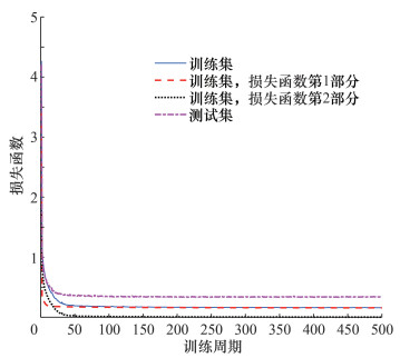 图 4给出了模型训练过程中损失函数随训练周期的演化情况。可以看出,训练集的损失函数在50个训练周期内急剧下降,而测试集的损失函数在25个周期内就急剧下降至接近收敛的状态。图 4中还分别绘制了损失函数中第1部分和第2部分的演化曲线。损失函数的第2部分(