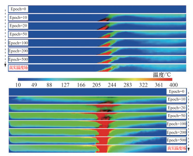| 图 5 训练集中随机选取的2个案例在训练过程中由标量信息预测温度场信息的预测结果演化情况 |