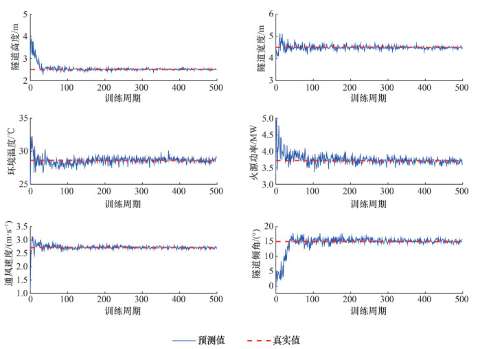 图 6显示了训练过程中模型对控制参数标量信息预测能力的增强过程。该结果为从训练集中随机选取的某案例的结果。图 6中红色直线为案例的真实值,蓝色曲线为训练过程中的预测值。可以看出,各控制参数预测值在训练初期都没有接近真实值,在训练周期达到50左右时,基本上所有参数都近似收敛到真实值。隧道高度、隧道宽度、通风速度和隧道倾角在训练周期达到100以后的振荡程度非常小,说明模型对这些变量的辨识程度非常高;而环境温度和火源功率的预测结果随训练周期的振荡程度相对强一些,说明模型对环境温度和火源功率的辨识难度相对更高,这可能是因为环境温度对整个温度场的影响能力较弱,而且由于燃烧的不稳定性,火源功率也不易确定。但总体而言,6项关键控制参数的预测结果都展现了模型良好的预测能力。