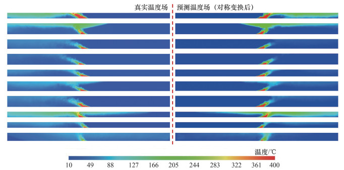 | 图 7 测试集中所选取不同控制参数下的真实温度场与预测温度场(经过左右对称变换)对比 |