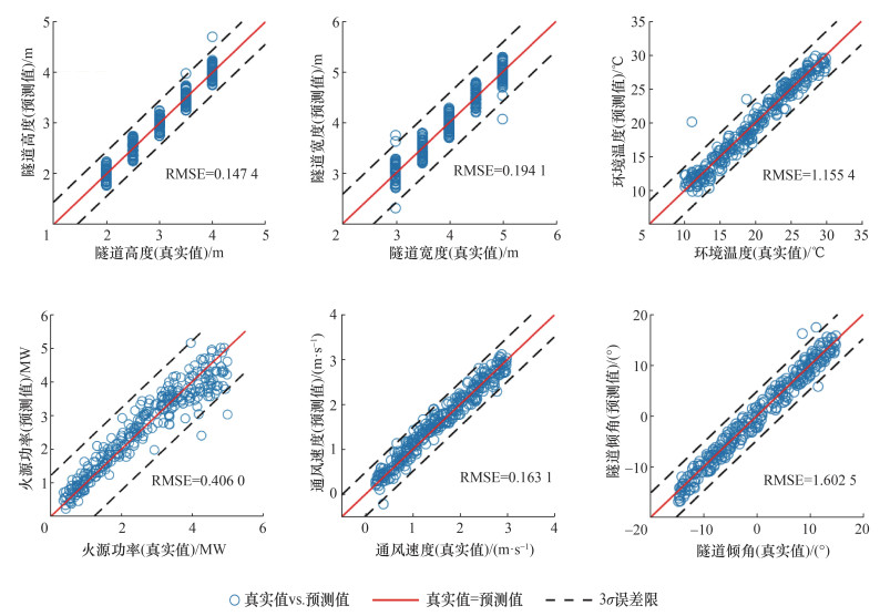 此外,由物理场信息预测控制参数等标量信息同样重要。图 8为网络中编码器所预测的结果和真实结果的对比。可以看出,均方根误差(root mean square error, RMSE)总体而言相对真实值的量级较小,预测效果较好。然而,模型对隧道宽度的预测效果相对弱一些,可能是由于隧道宽度对温度场的影响相对较弱。此外,火源功率的预测效果也相对较弱,其原因与之前的分析类似,这可能是由于火源功率是相对敏感的参数,燃烧本身的不稳定性[20]导致该指标难以预测。其他指标如隧道高度、通风速度、倾斜角度等都获得了相对较好的预测效果。
