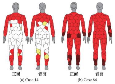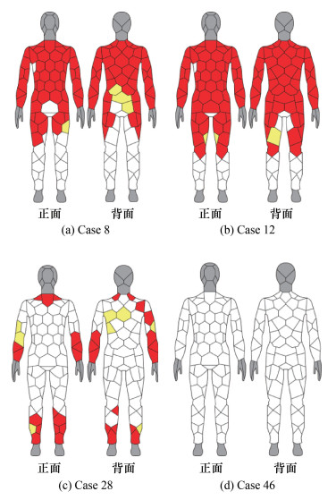 服装厚度对烧伤分布的影响也较为显著。当服装厚度为0.3 mm时,大部分模型人体表面出现烧伤,且Case 3(HF8, HE4, CT1, CE5)和Case 51(HF7, HE9, CT1, CE2)全部出现了二级或三级烧伤(图 8),这些模型的热流密度较大或热暴露时间较长。当服装厚度为最大的1.9 mm时,热流密度为最大且热暴露时间最长的Case 68(HF9, HE9, CT9, CE9)仍然全部出现二级或三级烧伤,且其他热流密度较大或热暴露时间较长的模型也出现了烧伤,说明在本研究中,火场因素的影响比服装厚度更显著。