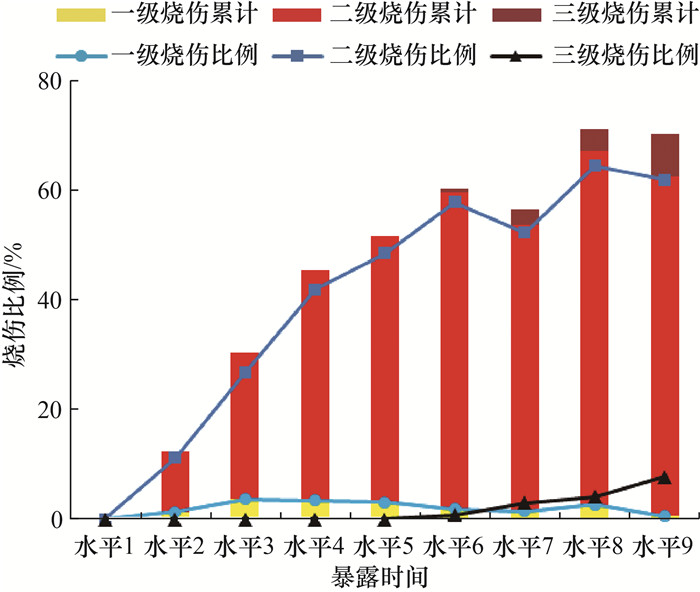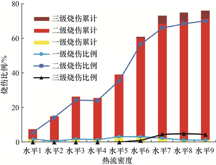 1) 随着热流密度和热暴露时间的增加,总烧伤比例呈升高趋势。人体各区域皮肤厚度不同导致烧伤等级转化阈值的差异,是造成烧伤比例不完全随暴露时间增加的原因之一。明确安全作业时间或距离对消防员职业安全具有指导作用。