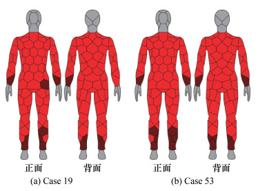 当热暴露时间为1 s时,9组模型人体表面均未出现烧伤。当热暴露时间为2 s时,所有模型均出现烧伤,且集中在颈部、小臂和小腿。当热暴露时间增加到8 s时,Case 19(HF7, HE8, CT4, CE6)和Case 53(HF8, HE8, CT8, CE8)中服装覆盖的人体表面全部出现烧伤(图 6),出现部分烧伤的模型主要分布在人体的上半身。热暴露时间9 s的烧伤分布与8 s类似。通过分析发现,热暴露时间较长时,人体出现烧伤的部位集中在上半身,主要原因是火焰的发展以及热气流的积聚和上升导致燃烧室内上半部分的温度升高。