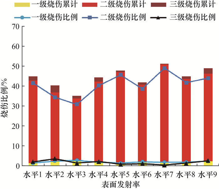图 9所示为不同服装表面发射率条件下,各级烧伤面积占服装覆盖人体表面积的百分比。通常认为减小服装表面发射率可以降低皮肤烧伤[13]。本文对不同热暴露条件下的服装表面发射率研究表明,总烧伤比例随服装表面发射率的升高没有明显规律。与织物的平面状态不同,服装在穿着状态下各部位表面之间、服装表面与热源之间存在不同角度,从而影响服装表面的实际入射热流。Frankman等[14]研究表明,在森林火灾中对流同样是重要的传热方式。对于处在火灾中心的人体,热对流、热辐射和热传导以一定比例进行组合,而服装表面发射率仅能表征假人表面对辐射热的吸收比例。另外,前期研究表明火灾环境中热传递方式会随着时间的推移不断变化[15],本研究采用的燃烧时间为1~9 s,同样是导致服装表面发射率对烧伤比例无显著影响的重要原因。