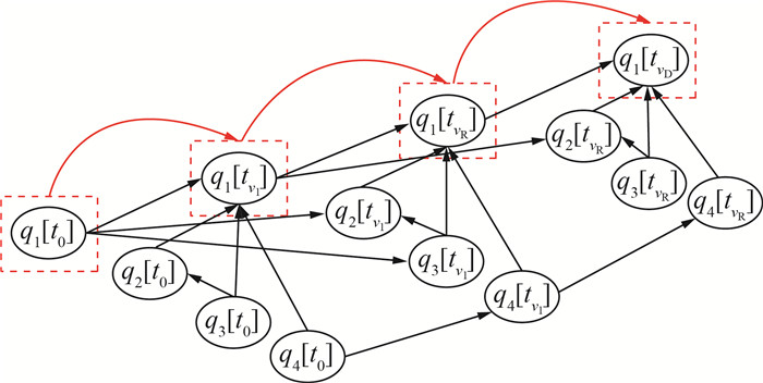 1.2 动态Bayes网络动态Bayes网络(dynamic Bayesian networks, DBN)是BN在时间维度上的扩展,可用一个二元组〈A0, A〉来表示。其中:A0表示初始网络,即初始时间片的BN,定义了同一时间片网络节点的先验概率分布;A表示转移网络,由2个以上时间片的BN组成,定义了不同时间片节点间的转移概率分布。设变量集X={X1,…,XN},时间片为[0, 1, …,T],则P(X0, …, XT)的联合概率分布为