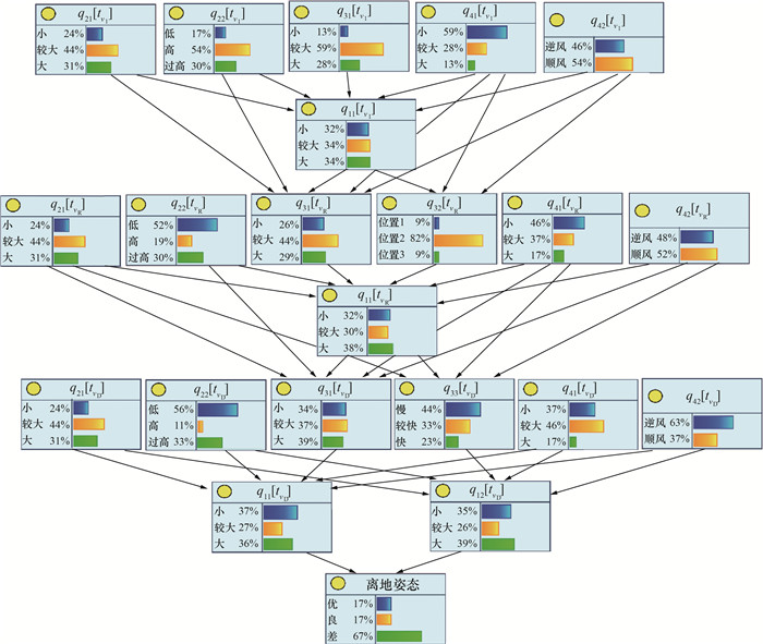 4 结论本文针对飞机离地过程风险应对问题,以飞机离地时刻飞行姿态为核心,根据“安全Ⅱ”模式,运用动态Bayes网络方法,构建了飞机离地姿态与飞行操作“因果-时序”耦合模型。利用国内某航司A319机队实际飞行QAR数据进行模型验证与情景分析,得出“重载”“轻载”“顺风”“逆风”等单一情景和组合情景的最佳飞行操作模式,有助于提高飞行员的离地风险应对能力。