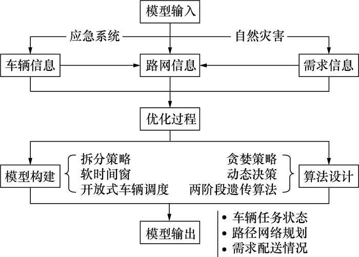1 问题表述 1.1 约束性车辆路径问题约束性车辆路径问题,即在一定的约束条件下,规划合理的行驶路线并达到一定的决策目标[16]。针对灾后救援工作的物资流向与时效要求,开展基于需求紧迫度的约束性车辆路径问题研究符合实际应急需求,可以确保薄弱受灾点优先得到应急物资,同时不失全局救援的一般效率。本文提出基于需求紧迫度的约束性应急物资车辆路径模型,根据需求拆分策略规划车队的路径和运送顺序,将应急物资由多个集中供应点配送到各受灾点,及时进行物资补给并投入循环调度。在物资配送过程中主要考虑载重量、软时间窗和行驶长度等约束性条件,使整个应急过程的总调度服务时间最短、配送延误惩罚最小、需求未满足率最小。约束性车辆路径问题求解步骤如图 1所示。