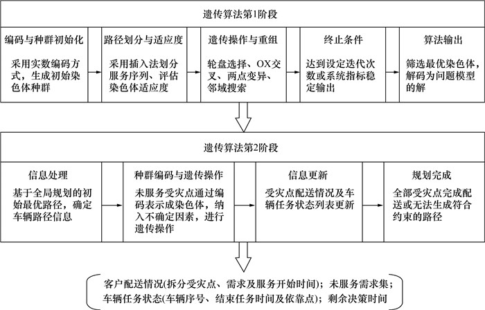 考虑需求拆分、软时间窗、开放调度的约束性,应急物资车辆路径模型属于非确定性多项式(non-deterministic polynomial,NP)-hard问题,而遗传算法具有内在隐并行性和全局寻优能力,操作算子可加快算法收敛、提高解集质量,因此设计如图 2所示的两阶段遗传算法进行求解。第1阶段对受灾点进行需求拆分与初始聚类,基于受灾点的需求紧迫度确定物资配送的首轮调度;第2阶段完成车辆路径的动态规划,基于覆盖模型分配物资补给仓库,车辆循环投入调度。区别于受灾点分配和路径规划相互独立的一般方法,本研究所应用遗传算法的遗传算子(选择算子、交叉算子和变异算子,即图 2中的轮盘选择、OX交叉和两点变异)和车辆任务信息都进行了改进,能够更加灵活、动态地规划物资配送与车辆路径,从而跳出区域限制与局部最优解。