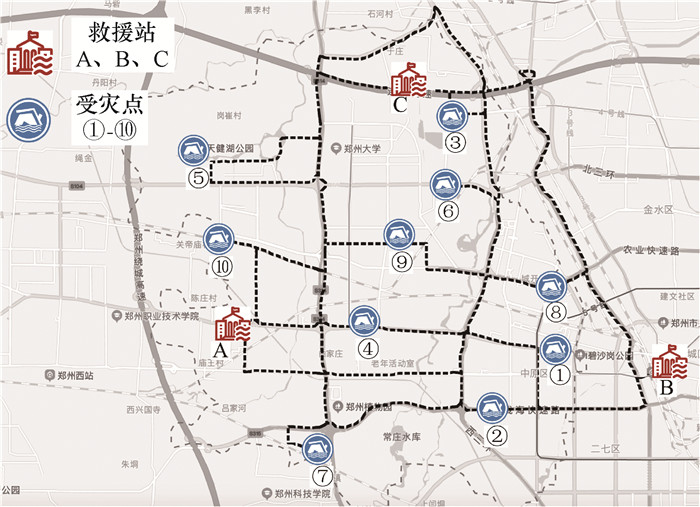 选取河南省郑州市中原区的路网进行道路提取,如图 3所示。以2021年7月郑州特大暴雨后的应急物资配送为案例背景,选取3个储运便利的地点(工贸园A、郑州站B和高速服务站C)作为救援站,选取10个典型的居民区作为受灾点。依托层次分析法、全球定位系统(global positioning system,GPS)以及人口物资比例,10个受灾点的需求权重总排序以及相应物资需求量如表 3所示。考虑不同维度的灾情信息及需求紧迫度排序,得到各受灾点的送达软时间窗分别为:40、29、54、38、57、43、65、46、35、62 min。假设决策周期时间为150 min,车辆最长行驶时间为90 min。车辆装载量为200件,救援站A、B、C初始分别有2、3、1辆配送车辆。