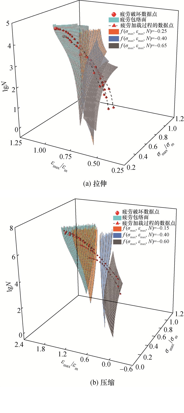 | $ \begin{gather*} g\left(\sigma_{\max }, \varepsilon_{\max }, N_{\mathrm{p}}\right)= \\ a_{\mathrm{c}}\left(\sigma_{\max } / \sigma_{\mathrm{m}}\right)+b_{\mathrm{c}}\left(\varepsilon_{\max } / \varepsilon_{\mathrm{m}}\right)+c_{\mathrm{c}}\left(\lg N_{\mathrm{p}}\right)+d_{\mathrm{c}} . \end{gather*} $ | (3) |