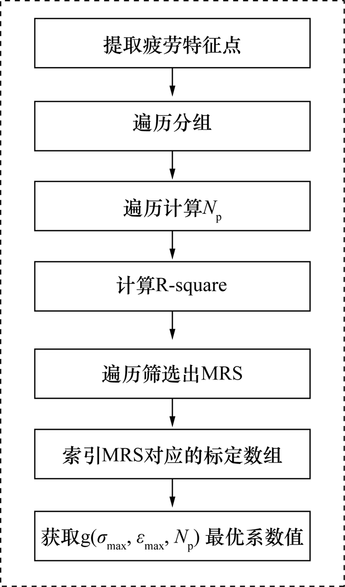 图 4总结了本文提出MRS(maximum R-Square)算法的求解流程。首先提取疲劳试验结果中的特征点,然后按照等效标定所需要的特征点个数进行遍历分组,遍历计算Np,按照式(4)计算R-square,比较每组R-square的大小筛选出MRS并索引其对应的标定数组,最终得到g(σmax, εmax, Np)的最优系数值。