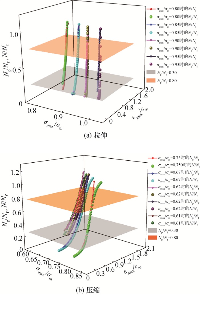图 5比较了混凝土材料在拉伸或压缩条件下,不同σmax/σm条件下的Np/Nf。可以看出,Np与Nf数值接近且在疲劳加载过程中呈现出的变化趋势一致。N/Nf与Np/Nf分别表达了混凝土材料实际与等效的疲劳破坏程度的物理意义,Np/Nf可作为疲劳预警值,是量化混凝土材料疲劳状态的重要指标。疲劳预警值被设定为2级:第1级为预防疲劳破坏发生的预警值,可取为0.30;第2级为临近疲劳破坏的预警值,可取为0.80。