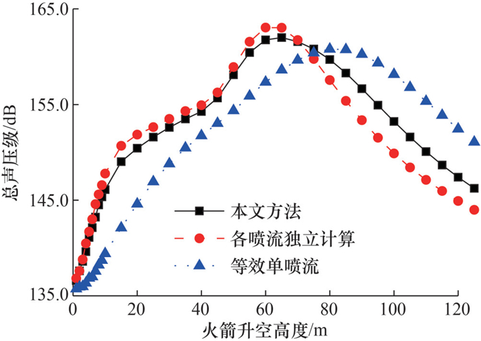 采用本文方法、各喷流独立计算方法及等效单喷流方法分别计算不同火箭升空高度下预示点噪声总声压级,多喷流不同等效方法对比如图 10所示。火箭芯级并联4台发动机,4个助推各分布1台发动机,所有发动机出口燃气参数一致。与各喷流独立计算方法相比,本文方法峰值位置偏后,峰值位置前总声压级较小,峰值位置后总声压级较大,且峰值范围较宽;与等效单喷流方法相比,本文方法峰值位置则靠前。原因如下:当各喷流独立计算时,各喷流核长一致且相对较短,声源分布密集且靠前;当全部等效为单喷流时,出口等效直径增大,以式(19)计算的核长增大,声源整体按比例向下游方向偏移,最大声源区域长度增大、位置靠后。本文方法避免了上述2种极端情况,更接近实际火箭喷流形态。