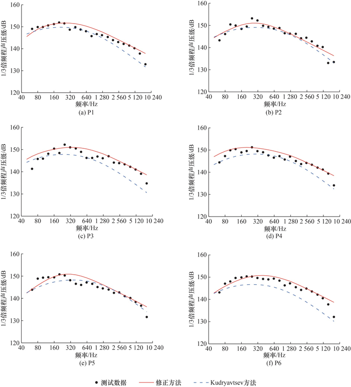 某火箭起飞后,不同升空高度和不同测点的测试数据与2种方法的预示值的对比结果表明:修正方法与Kudryavtsev方法相比,具有更高的总声压级和声压级谱预示精度。火箭起飞2 s内,修正方法的预示精度相较Kudryavtsev方法提高约10.0 dB;修正方法预示声压级峰值时刻更准确,且峰值时刻附近声压级最大误差不超过3.0 dB;修正方法的峰值时刻声压级谱全频段最大误差小于6.0 dB,峰值频率和频率1~5 kHz等关键频段声压级误差小于3.0 dB,优于Kudryavtsev方法。本文所提修正方法提高了预示精度,能更好地应用于实际工程。
