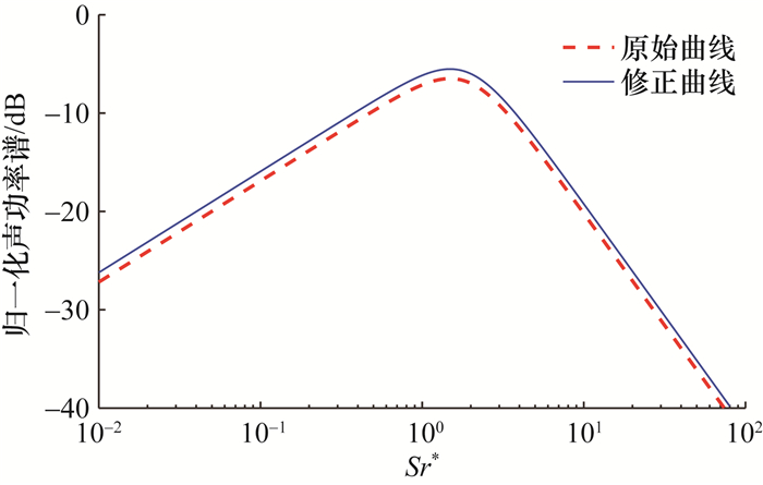 文[5]给出了声功率沿喷流轴线分布归一化曲线和点声源归一化声功率谱。分析文[5]中的经验曲线,发现积分结果均小于1,不符合归一化要求,可能造成预示值偏小。本文对经验曲线进行了拟合,并对拟合公式的系数进行修正,使曲线整体上移,满足归一化条件,修正后的点声源归一化声功率谱如图 2所示。修正后喷流轴线声功率分布和点声源归一化声功率谱的经验公式表示如下: