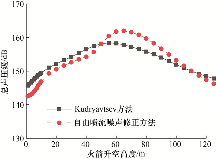 图 4比较了自由喷流噪声修正前后,不同火箭升空高度下预示点噪声总声压级。其中预示点高度40 m,距火箭轴线15 m。自由喷流噪声修正方法的预示点噪声总声压级峰值位置偏后且峰值更高,在火箭升空高度小于50 m和大于110 m时总声压级偏小。2种方法差异的原因主要是指向性不同,Kudryavtsev方法的总声压级变化趋势与火箭起飞过程中主要声源区域距预示点距离变化情况一致;自由喷流噪声修正方法除受距离影响外,还受指向性修正影响,当预示点位置处于主要声源区域下游附近时,受到指向性正修正,总声压级较高,否则会受到指向性负修正,总声压级较低。