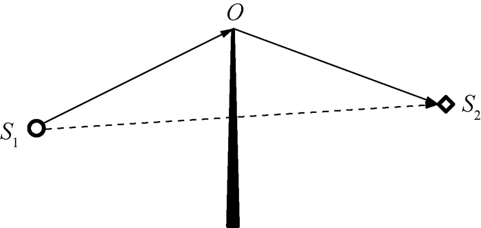 分析噪声传播路径,发射平台下方受扰自由喷流噪声会受到发射平台的遮蔽(图 1中路径L2),而导流槽出口噪声受到勤务塔遮蔽(图 1中路径L3)。火箭刚点火起飞时,大部分喷流位于发射平台下方,此时主要噪声源为发射平台受扰自由喷流噪声和导流槽出口噪声,因此遮蔽衰减估计对声压级预示尤为重要。本文遮蔽衰减估计采用Maekawa声遮蔽模型[19],如图 5所示,S1点为声源,S2点为目标点,O点为声障边缘。路径S1S2为无声障时噪声传播路径,路径S1O-OS2为有声障时噪声实际传播路径,则Fresnel数N表示如下: