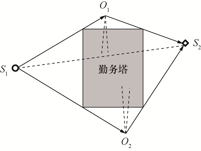 勤务塔厚度较大,需要根据噪声传播路径进行声障等效,等效的噪声遮蔽模型如图 7所示,其中O1和O2分别为2个等效声障边缘。由于勤务塔的高度远大于宽度,因此需要先采用式(24)和(25)分别估计两侧噪声声压级谱,再叠加获得修正声压级谱。