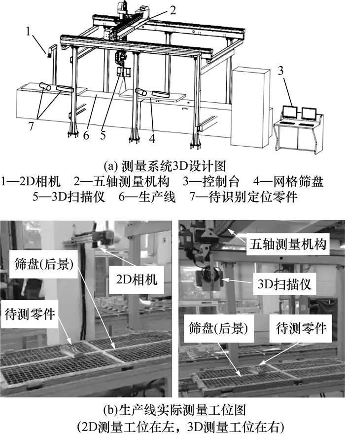 1 定位测量系统设计 1.1 硬件系统本文硬件系统的3D设计图和实际测量工位图分别如图 1a和1b所示。由图可知,当传送带某个网格筛盘到达2D相机测量工位后,2D相机采集零部件和网格筛盘图像;当筛盘到达3D扫描仪测量工位后,五轴测量机构根据2D图像处理所得的位置信息操纵3D扫描仪移动到指定位置进行拍摄,获取点云信息。五轴测量机构包含3个直线轴(X、Y、Z)以及2个旋转轴(A、C)。
