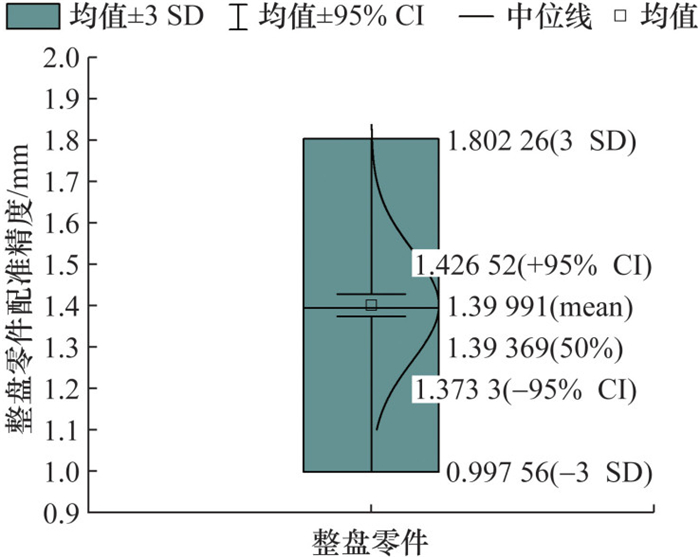 基于上述85次数据,分析了整盘零件的配准精度。如图 10所示,可以看出零件的配准精度均值为1.40 mm,均值95%置信区间为1.43~1.39 mm,整盘零件的平均配准精度有99.73%的概率在1.00~1.80 mm的范围内。这表明该系统对于多种大小、形状、颜色不同的零件均具有较强的鲁棒性。