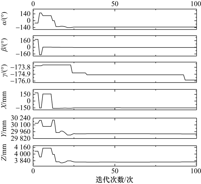 3.1 粒子群算法初始化为了提高计算效率,对测量的3D点云进行抽样参与配准计算。首先在扫描的点云中取X、Y、Z3个方向共计6个极大、极小值点,并对剩下的点云进行随机采样构建配准点云S={sk∈R3, k=1, 2, …, n}。与之相对应的,有理论数模点云Q={qj∈R3, j=1, 2, …, m}和PSO粒子群P={pi∈R6, i=1, 2, …, N}。初始粒子群以旋转参数(αi(t), βi(t), γi(t))和平移参数(xi(t), yi(t), zi(t))作为第i个粒子的广义维度参数,t表示第t次迭代。每个粒子的初始生成方法如下:
