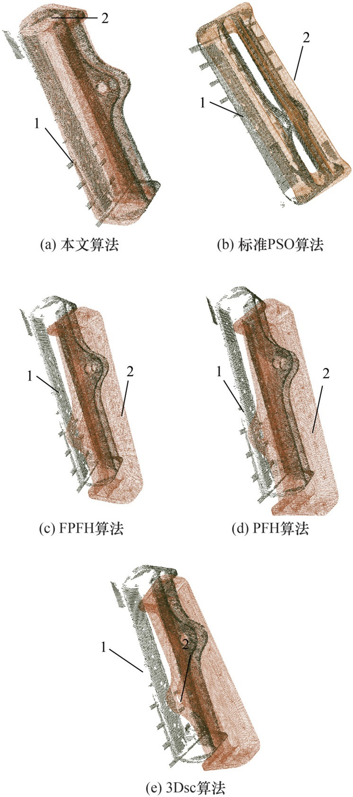 在本节中,使用与5.1节相同的机械加工零件点云作为配准目标点云,以理论数模点云作为待配准点云。使用已有的标准PSO算法、3Dsc算法、FPFH算法、PFH算法与本文算法进行配准结果的对比,结果如图 14所示,图中标记1为理论数模点云,标记2为扫描所得零件点云。由图可知,上述对比算法相较于本算法具有显著的匹配误差。