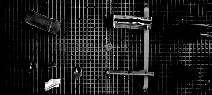 2 平面图像处理与点云分割 2.1 平面图像处理对图像依次进行除畸变、滤波、灰度均衡化、二值化、形态学处理、小轮廓剔除、轮廓提取等处理,分割图像前景和背景,识别出图像中的零件。2D相机捕获的原始图像如图 2所示。