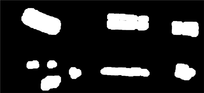 为去除底部网格筛盘对图像造成的影响,分别使用“十”字形和椭圆形内核结构进行开运算操作。对开运算后的杂质点残余采用轮廓提取,并对面积小于阈值的轮廓进行填充。最后采用矩形内核结构对图像进行膨胀处理,处理后的图像如图 3所示。