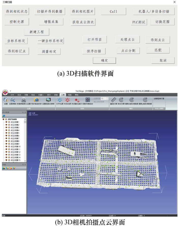 目前二维(2D)视觉检测技术主要有2种:一是运用传统图像处理算法,实现前后景分割与模板建立[1];二是通过机器学习算法学习目标特征,通过特征匹配提取目标[2]。由于工业零件种类繁杂难以建立数据集,且工业环境存在各种不确定因素[3],因此可采用形态学运算和k-均值(k-means)聚类等传统图像处理方案,实现零件的粗分类、粗定位等信息提取。在航空零件喷涂生产中,往往是多种零件混线喷涂。由于零件种类丰富,且摆放方式多样,单纯依靠2D图像难以准确判断其位姿和种类,而三维(3D)相机的单幅拍摄范围有限,需要进行多位姿拍摄组合形成完整的点云数据。